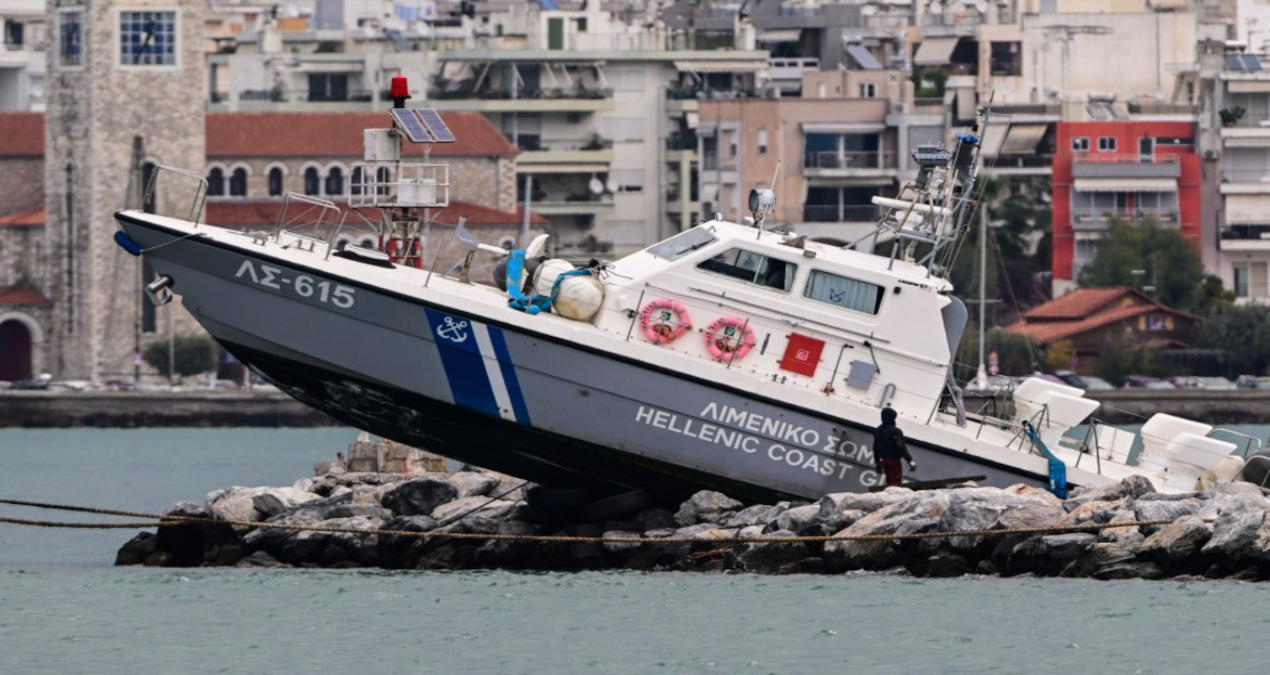 Yunanistan’ın Ege denizindeki sahil kasabası Volos yakınlarında güpegündüz kayalıkların tepesine kadar çıkan sahil güvenlik botu görenlEri şaşkına çevirdi. Olayda şans eseri yaralanan olmadı.